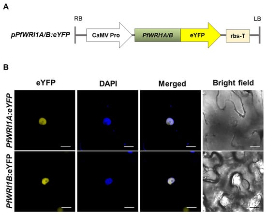 To isolate PfWRI1A and PfWRI1B cDNAs and further examine their subcellular localization, the generated cDNAs were amplified by PCR using SacI-PfWRI1_F1 and XmaI-PfWRI1_R1 primers (Supplementary Table S1). The amplified PfWRI1s PCR products were digested with SacI (5′ terminus) and XmaI (3′ terminus) and then cloned into the binary vector pPZP212. Two WRI1 isoforms, PfWRI1A, and PfWRI1B were identified after sequencing of the clones. PfWRI1s were translationally fused with eYFP in the pPZP212 vector and expressed under the control of the CaMV promoter. Subsequently, the binary constructs were transformed into Agrobacterium tumefaciens GV3101 using the freeze-thaw method [49]. The transformed Agrobacteria suspended in infiltration media (10 mM MES, pH5.7, 10 mM MgCl2, 200 µM acetosyringone) were infiltrated into N. benthamiana leaves. The infiltrated leaves were observed using a confocal laser scanning microscope (Leica TCS SPE, Weitzlar, Germany) 48 h after infiltration. The YFP fluorescence signal was observed at 488 nm excitation and 532 nm emission wavelengths. To visualize the nucleus in the infiltrated leaves, the leaves were stained with DAPI solution (5 µg/mL in PBS) for 5 min, washed 1–2 times with DW, and then the fluorescent signals were obtained at 359 nm excitation and 461 nm emission.