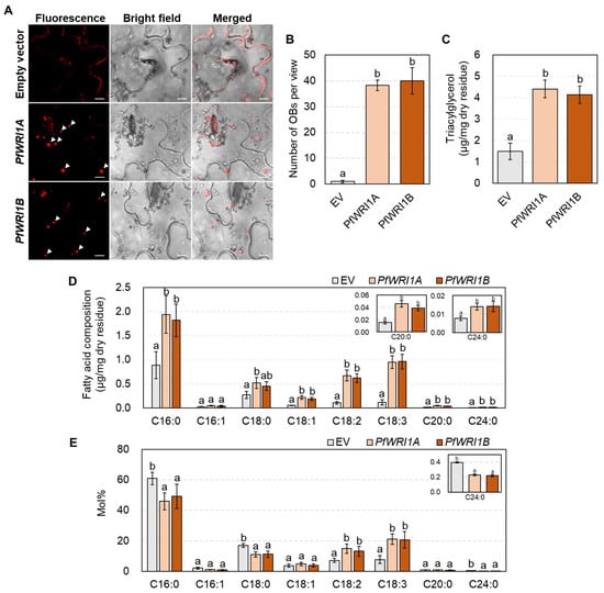 In the fatty acid composition in the TAG fractions accumulated in N. benthamiana leaves expressing AtWRI1, StWRI1, AsWRI1, PtWRI1, or CeWRI1, interestingly the ratio of C18:3 were increased, but the proportions of C18:0 were remarkably decreased in all transgenic leaves compared to transformed control [42]. An et al. [37] reported that the levels (mol%) of C18:1 were increased, but the amounts of C18:0 were decreased in the TAG fractions isolated from leaves expressing CsWRI1A, B, or C. Interestingly, we observed an increase and a decrease in the levels (mol%) of polyunsaturated fatty acid (C18:2 and C18:3) and saturated fatty acids (C16:0, C18:0, and C24:0), respectively, in the TAG fractions induced by the overexpression of PfWRI1A or PfWRI1B compared to the transformed control (Figure 4C). A similar observation was also reported in N. benthamiana leaves expressing RcWRIA or RcWRIB [52]. Therefore, the overexpression of plant WRI1s can alter the ratio of saturated and unsaturated fatty acids in the TAGs accumulated in leaves and they are possibly useful for the production of storage oils with high unsaturated fatty acids in vegetative organs.