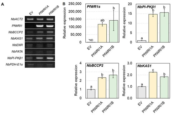 Expression of its target genes in N. benthamiana leaves expressing PfWRI1A or PfWRI1B. (A) RT-PCR analysis of its target genes in N. benthamiana leaves expressing PfWRI1A or PfWRI1B. Total RNA was isolated from N. benthamiana leaves expressing PfWRI1A, PfWRI1B, or empty vector control and converted to the cDNA, which was subjected to the RT-PCR analysis. N. benthamiana Actin2 was used to determine cDNA quantity and quality. (B) RT-qPCR analysis of its target genes in N. benthamiana leaves expressing PfWRI1A or PfWRI1B. NbActin2 was used to normalize the levels of PfWRI1s and their target genes’ transcripts. Each value is the mean of three independent measurements ± standard error. Data were statistically analyzed using ANOVA test (p < 0.01). * ND indicates non-detected.