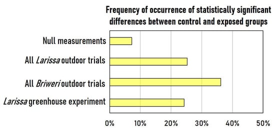 We examined how frequently statistically significant differences in these 50 different OJIP parameters were identified. As depicted in Figure 1, there were few discrepancies between the two groups in the null measurements. In contrast, once the plants were subjected to RF-EMF exposure, significant differences to control groups were observed. The trials with cultivar Briweri yielded generally more differences than those with Larissa.