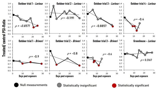 We also calculated the Spearman’s rho rank correlation coefficients between the treated/control PSI ratios and exposure duration. In the outdoor trial 2 (Larissa) as well as in the greenhouse experiment (Larissa), we observed just weak correlations between these two variables. In the other six out of seven field trials, large Spearman’s correlation coefficients (−1.0 < ρ < −0.4) indicate moderate to strong negative correlation between treated/control PSI ratios and the exposure period, implying that in these trials, the photosynthetic performance of the treated plants became progressively worse compared to that of the control groups as the irradiation continued.