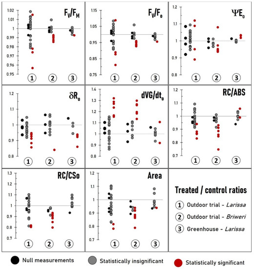 Distribution of treated/control ratios concerning the eight OJIP parameter under investigation: FV/FM—the maximal quantum yield of PSII photochemistry; FV/FO—the maximal quantum yield of oxygen-evolving complex (OEC); ΨEO—quantum yield of the electron transport in the intersystem electron chain (from QA to plastocyanin PC); δRO—quantum yield of the reduction in end acceptors at PSI side; dVG/dtO—excitation energy transfer between the reaction centers; RC/ABS—effective antenna size; RC/CSO—reaction center density; area—pool size of reduced plastoquinone (PG) on the reducing side of PS II. The results are separated into three groups corresponding to outdoor trials with cultivar Larissa (1), outdoor trials with Briweri (2) and greenhouse experiment with Larissa (3). A dot symbolizes the treated/control ratio of each measurement point, in other words the difference between two groups at each measurement day: black—null measurements; gray—no statistically significant difference between treated and control groups (p > 0.05); red—statistically significant difference from two groups (p < 0.05). A treated/control ratio larger than one in case of dVG/dtO or less than one in case of all other parameters indicates lower photosynthetic efficiency in treated plants compared to control plants.