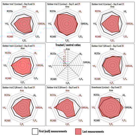 Spider plots depicting the treated/controls ratio at the first (null) and the last measurement time points for the eight OJIP parameters stated earlier. We substituted dVG/dtO with its reciprocal value 1/dVG/dtO so that all parameters correlate positively with photosynthetic efficiency. The plot’s scale is displayed in the center. If a parameter’s label is red, the last measurement revealed a statistically significant difference (p < 0.05) between RF-EMF-exposed and control plants with relation to that particular parameter.