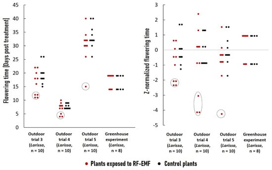 Flowering time comparison of plants continuously exposed to RF-EMF and controls. In total, there were 3 independent experiments under outdoor conditions (outdoor 1, 2, 3) and one under indoor conditions (greenhouse), each with equal numbers (8–10) plants from each group. The dots represent flowering time of individual plants. (Left) Flowering time (days after experiment onset). (Right) Normalized flowering time based on the mean and standard deviation of the control group’s data (Z-scores). The subsets of treated plants that began flowering substantially earlier than the rest of the group and plants in the control group are indicated by circles.