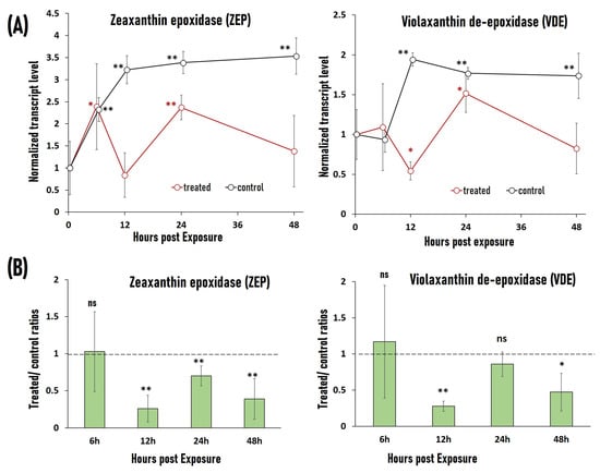 Gene expression analysis of stress genes violaxanthin de-epoxidase (VDE) and zeaxanthin epoxidase (ZEP) in lettuce plants exposed to RF-EMF. The reference gene is actin. (A) Normalized transcript levels of VDE and ZEP at 0, 6, 12, 24, and 48 h after RF-EMF treatment. The average transcript levels of all plants at Time 0 (start of the RF-EMF treatment) are determined as 1. Star symbols (*—0.01 < p < 0.05; **—p < 0.01) denote the statistically significant differences to VDE/ZEP levels at t = 0 (threshold p = 0.05). Error bars represent 95% confidence interval (n = 3). (B) The treated/control ratio of VDE and ZEP transcript levels at 6, 12, 24, and 48 h after RF-EMF treatment. Statistical symbols: ns—no statistically significant differences between control and exposed groups (p > 0.05), *—statistically significant differences (0.01 < p < 0.05), **—statistically highly significant differences (p < 0.01). Error bars represent 95% confidence interval (n = 3). Dotted line marks the position of treated/control ratio equal 1.