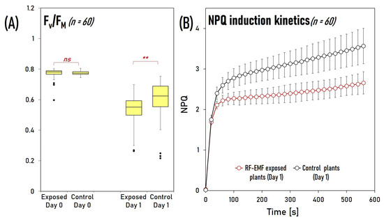 Comparison of the maximum photochemical quantum yield FV/FM of Photosystem II and the non-photochemical quenching (NPQ) of RE-EMF-exposed and control plants after one day of light stress treatment. (A) FV/FM of exposed and control plants before (Day 0) and after treatment (Day 1). Statistical symbols: ns—no statistically significant differences between control and exposed groups (p > 0.05), **—statistically highly significant differences (p < 0.01). (B) NPQ induction kinetics of exposed and control plants after one day light stress treatment. Error bars represent 95% confidence interval (n = 60). In all cases where the error bars do not overlap, the difference is statistically highly significant (p < 0.01).