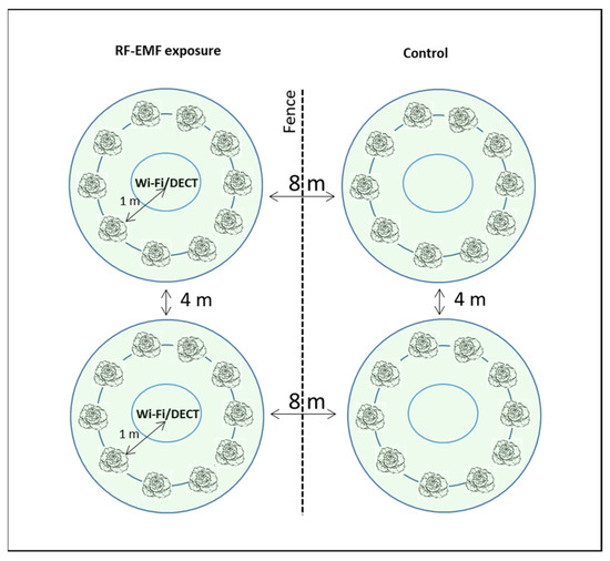 The 10 control plants (Figure 8) placed adjacent to the RF-EMF-exposed area were shielded from the adjoining RF-EMF emitters with a fine-mesh metal fence (mesh size 13 mm and height 120 cm) and therefore served as a reference in the outdoor experiments. The RF-EMF-exposed plants were approximately 8 m apart from the control plants. In the greenhouse studies, the control groups were housed in another separate phytochamber. In both cases, the RF- and high frequency analyzers were used to validate the minimal level of RF-EMF that the control groups were exposed to.