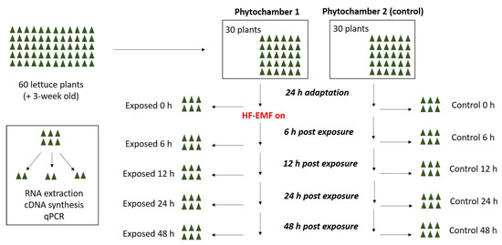 Sixty three-week-old Lactuca sativa plants were separated into two groups of 30 plants each and placed in two identical phytochambers (temperature 20° degrees Celsius, relative humidity 50%, light intensity 100 µmol/m2·s 24/24 h). After 24 h of acclimating to the new sites, RF-EMF was activated in one phytochamber while conditions in the other remained unchanged. Six plants were collected from both treated and control plants immediately before and 6 h, 12 h, 24 h, and 24 h after RF-EMF activation. These six plants were separated into three samples of two plants each and immediately frozen in liquid nitrogen (Figure 9). From each sample, total RNA was extracted and used for cDNA synthesis, which was subsequently used for quantitative real-time PCR (qPCR).