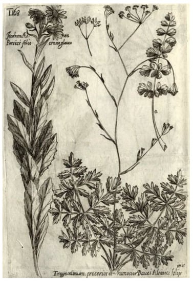 Pimpinella gussonei is a species exclusive to Sicily [21,23,24,25], an island that is well-known as a hotspot for endemic species [30,31,32]. The species grows from the sea level up to 1500 m asl in uncultivated farmlands, clearings and coppices [33]. The taxonomic history of this species is rather controversial. The earliest information can be found in Cupani [34], who in his pre-Linnean work Hortus Catholicus reports the species in Enna (Sicily, Italy) as “Pimpinella hircina, faxifraga”, and later [35] in “Panphyton Siculum” reports a detailed iconography and describes the species as “Tragoselinum procerior et ramosior, Dauci alsatici foliis imis”, i.e., as “a taller, ramose tragoselinum with basal leaves of Daucus alsaziano” (Figure 1). Several authors of Sicilian or Italian floras quote Cupani as Presl [36] who describe the species in the Linnean system, Gussone [37,38] in “Plantae rariores” and Bertoloni in “Flora italica” [39].