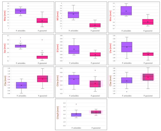 Boxplots of statistically significant fruit morphological characters of Pimpinella anisoides V.Brig. and Pimpinella gussonei (C.Presl) Bertol. Character abbreviations: fruit width (Mw); fruit length (Ml); length from the lower end to the point of maximum width (Mm); stylopodium width and length (Sw, Sl); length/width ratio (l/w); area per section (CSa); commissural vittae width (CVw); section width (CSw); commissural vittae width/thickness ratio (CVw/t). The terminology of fruit parts and section is in accordance with Kljuykov et al. [19], Akalın et al. [9], Yeşil et al. [18].