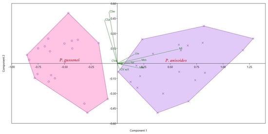 The PCA (Figure 5) clearly separates the fruits of P. gussonei and P. anisoides, showing a strong distinction between the carpological characters of the two species. In addition, the PCA shows that the first five characters with highest significance (Mw 76% variance, Ml 12% variance, Mm 4% variance, Sw 4% variance), explain 96% of the total variance. The biplot (Figure 5) also shows that some characters (Ml, Mm, Sw, Mw, l/w) contribute better to the characterization of P. anisoides than P. gussonei. On the whole, the characters concerning the external morphology of the fruit allow better distinction between the two species than the characters concerning the section of the fruit.