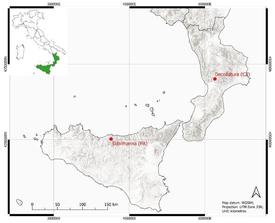 Map localities where fruit collections were carried out: Decollatura (Catanzaro—CZ) in Calabria for Pimpinella anisoides V.Brig. and Gibilmanna (Palermo—PA) in Sicily for Pimpinella gussonei (C.Presl) Bertol.