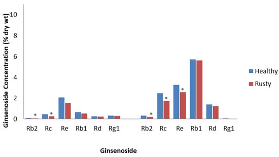 Effect of rusty root disease on specific ginsenosides. Percentage of ginsenoside by dry weight in the roots of 3- to 4-year-old P. quinquefolius roots collected from the field, with and without rusty root symptoms, based on the study by Rahman and Punja [] (left), and percentage of ginsenoside by dry weight in the roots of 4-year-old P. quinquefolius roots collected from the field, with and without rusty root symptoms, based on the study by Campeau and Proctor [] (right). Asterisks indicate significant differences.
