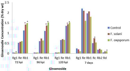 Several Fusarium species cause root rot in ginseng []. Jiao et al. [] inoculated cultivated P. quinquefolius roots of unknown age with the fungi F. solani or F. oxysporum, which had been isolated from diseased ginseng roots. The highest total ginsenoside concentration was at 120 h post-inoculation (hpi), when the water control and F. solani- and F. oxysporum-infected roots had 2.05, 2.17, and 2.24% ginsenoside DW, respectively. Re levels with both fungi and Rg1 levels with F. solani were not significantly different compared to the water control at 72, 96, or 120 hpi (Figure 2). In contrast, Rg1 levels were significantly lower than the control after F. oxysporum infection at 72 hpi, but Rb1 levels were significantly higher than the control with either F. solani or F. oxysporum infection at all time points. The results show that root infection increased ginsenoside levels, but the increase varied, depending on the fungal isolate. Among the ginsenosides tested, Rb1 was the only one to inhibit the germination of both fungi, indicating a possible role in host defense and a greater role for PPT than PPD ginsenosides in the host response.