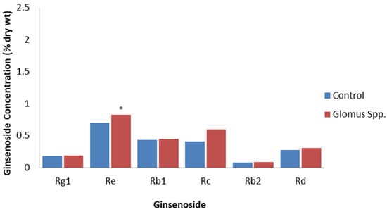Effect of Glomus spp. on specific ginsenosides. Percentage of ginsenoside by dry weight in roots for the roots of 1-year-old P. quinquefolius roots that are non-inoculated (control) or inoculated with a mixture of spores of G. etuticatum and G. intraradices one year after inoculation, based on the study by Fournier et al. []. Asterisks indicate significant differences.