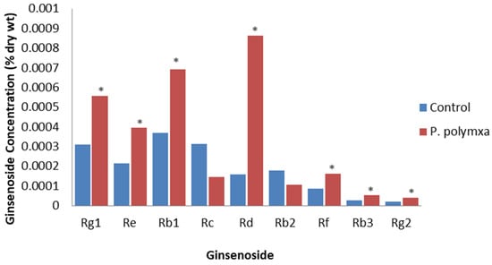 Effect of P. polymxa on specific ginsenosides. Percentage of ginsenoside by dry weight in the roots of 4-year-old P. ginseng roots inoculated with deionized water (control) or P. polymxa at 1 month post-inoculation, based on the study by Gao et al. []. Asterisks indicate significant differences.