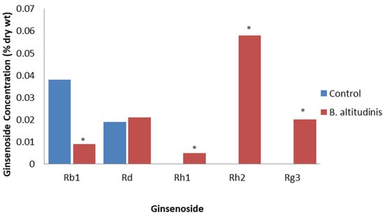 Effect of B. altitudinis on specific ginsenosides. Percent ginsenoside by dry weight in roots of P. ginseng adventitious root cultures inoculated with deionized water (control) or B. altitudinis at 12 days post inoculation based on the study of Song et al. []. Asterisks indicate significant differences.