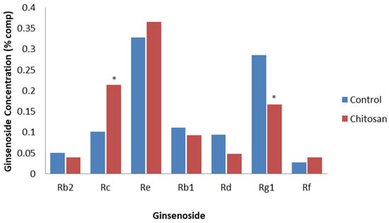 Effect of chitosan on specific ginsenosides. Percentage of ginsenoside by dry weight in the roots of 4-year-old hairy root lines of P. ginseng, with water (control) or chitosan treatment at 25 days post-treatment, based on the study by Palazon et al. []. Asterisks indicate significant differences.