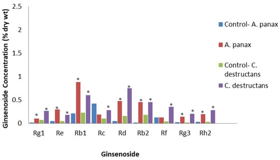 Effect of A. panax or C. destructans extracts on specific ginsenosides. Percentage of ginsenoside by dry weight in the roots of tissue culture cells of P. quinquefolius with no treatment (control) or a crude mycelial extract of A. panax or C. destructans at 8 days post-treatment, based on the study by Yu et al. []. Asterisks indicate significant differences.