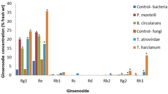 The effect of P. monteili, B. circulans, T. atrovirdae, or T. harzianum filtrates on specific ginsenosides. Percentage of ginsenoside by dry weight in the roots of root-forming callus of P. quinquefolius for nutrient broth (control-bacteria), potato dextrose broth (control-fungi), or 1.25 v/v% cell-free culture filtrates of the bacteria P. monteili and B. circulans, or fungi T. atrovirdae and T. harzianum at 15 days post-treatment, based on the study by Biswas et al. []. Asterisks indicate significant differences.