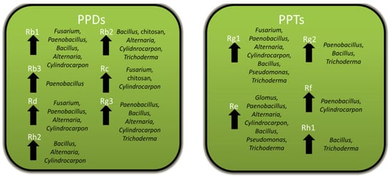 PAMPs from other non-pathogenic microbes can also affect root ginsenosides. Cell cultures of P. quinquefolius derived from a root callus were exposed to cell-free culture filtrates from the non-plant pathogenic soil bacteria, Pseudomonas montelli and Bacillus circulans, and the soil fungi, T. atrovirdae and T. harzianum []. At 15 days post-treatment, bacterial and fungal culture filtrates at either 1.25 or 2.5% significantly increased both PPDs and PPTs, but the largest changes were seen with the fungal culture filtrates. Compared to the control, the most effective was the 1.25% T. atrovirdae filtrate for the PPTs and the 2.5% T. atrovirdae filtrate for the PPDs. For the PPTs, Rg1 and Re were significantly increased with all the 1.25% bacterial and fungal filtrates, the most effective being the T. harzianum filtrate, while Rg2 and Rh1 were significantly increased with 1.25% P. montelli, T. atroviridae and T. harzianum filtrates, the most effective also being the T. harzianum filtrate (Figure 8). Increases in the PPDs also occurred, but the levels were very low and often undetectable. Based on a limited number of species, it appears that PAMPs from non-pathogenic soil fungi have stronger effects than those of non-pathogenic soil bacteria, and PPTs respond more strongly than PPDs.