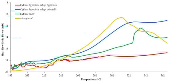 The thermal-oxidative decomposition of the pure extracts was studied using DSC. In comparison to the Rancimat method, DSC is concluded to be useful as a method employing milder conditions and a shorter time, which can be applied for the evaluation of the oxidative stability of samples containing volatile antioxidants and other lipid systems containing water [27]. An exothermic peak is observed in the range of 200 to 365 °C, related to the auto-oxidation process of the samples. Using the curves, the onset temperature (To) at which the auto-oxidation process begins is determined [28]. Cytinus taxa (C. hypocistis subsp. hypocistis, C. hypocistis subsp. orientalis, and C. ruber) showed the highest oxidative stability in the DSC method. Owing to the results of the statistical analysis (vide infra), more emphasis was placed on the extracts from the Rafflesiaceae family. The effects of the thermal profile of pure extracts (family Rafflesiaceae) compared to α-tocopherol are shown in Figure 1. The onset temperature (To) of the Rafflesiaceae family curves ranged from 300 to 335 °C and was similar to that of α-tocopherol (313 °C).