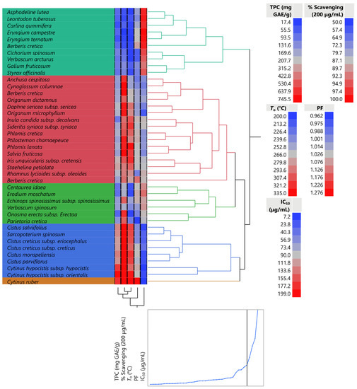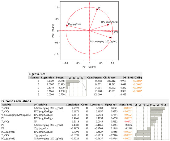 According to the PCA plot in Figure 2, TPC, To, and DPPH all have nearly identical loading directions; however, PF has a different loading direction and clearly differs from the other variables in terms of IC50. As can be seen, TPC is more strongly, positively associated (>0.7) with the To parameter and is less strongly correlated (>0.4) with PF. Additionally, the highest correlation (0.797) was found between To and the % scavenging, which was found to be statistically significant (p < 0.0001). Furthermore, it is well known that the IC50 and % scavenging of DPPH radicals correlate negatively. A higher antioxidant activity is associated with lower IC50 concentrations. Thus, higher TPC concentrations are reflected in lower IC50 results.