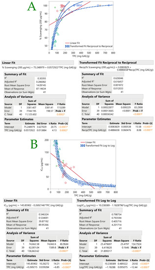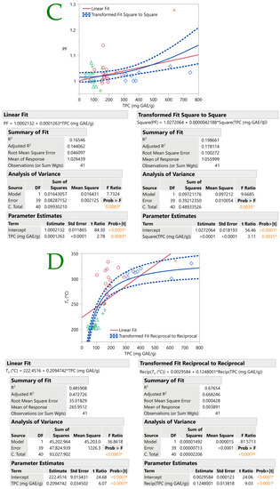 Figure 4 shows the fit curves for antioxidant assays by TPC. In each plot, the linear fit and various statistics were displayed (i.e., equation, summary-of-fit, ANOVA, and parameter estimates). The linear fits, however, exhibited a low R2. Thus, curve fitting was carried out so as to have a better fit. Following that, the transformation fit had a higher R2 than the linear fit. Regarding the % DPPH scavenging in relation to the TPC, a reciprocal curve fit was found to be the most suitable, with an R2 value of 0.63. This was also the case for TPC and To (R2 = 0.68). A logarithmic plot curve was found to be the most suitable in explaining the relation between IC50 values and TPC (R2 = 0.80). Otherwise, a linear positive correlation between the total phenolic content and antioxidant activity was reported in the study of Skotti et al. [9].