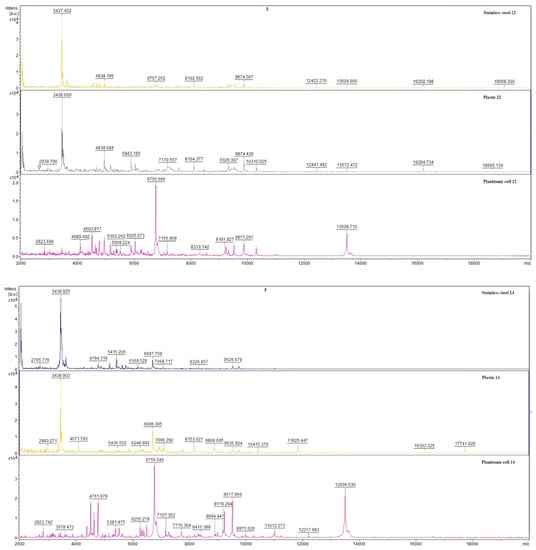 Samples were analyzed by MALDI-TOF MS Biotyper mass spectrometry on days 3, 5, 7, 9, 12, and 14 of the experiment. Biofilm samples were collected with a sterile cotton swab from both surfaces and applied to a MALDI-TOF metal target plate. Planktonic cells obtained from the culture medium were also subjected to analysis. From the culture medium, 300 μL were collected and centrifuged at 12,000 rpm for 1 min. The supernatant was poured off and the pellet was washed 3 times with 30 μL of ultrapure water. Finally, the clean pellet was resuspended in 30 μL of ultrapure water and 1 μL was applied to a MALDI-TOF target plate. The samples were allowed to dry at room temperature.