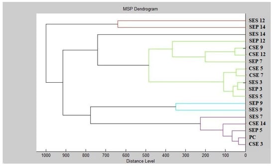 The dendrogram constructed from the individual MSP distances of the control and experimental mass spectra serves as a visualization of the interrelatedness of biofilms on different surfaces (Figure 2). The constructed dendrogram shows that the shortest MSP distances between the control and experimental groups were observed during days 3 and 5 of the experiment (SES 3;5 and SEP 3;5) along with the control groups throughout the length of the experiment indicating that very little change in the molecular structure of the biofilm was occurring at this time under the influence of CSEO. From day 7 of the experiment (SES 7 and SEP 7) onwards, there was a significant lengthening of the MSP distances of the experimental group from the controls, which is evidence of the inhibitory effect of CSEO against the S. enterica biofilm. This trend persisted for the rest of the duration of the experiment. The most significant increases in MSP distances for the experimental groups were observed during days 12 and 14 of the experiment (SES 12;14 and SEP 12;14) indicating significant biofilm inhibition. Based on this evidence, we conclude that CSEO has the potential to act as an antibiofilm agent against S. enterica biofilm which confirms the findings inferred from the mass spectra analysis.