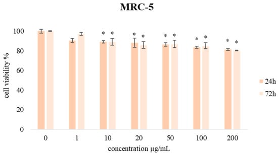 The effects of six concentrations of CSEO on MRC-5 cell viability after 24 h and 72 h of treatment. Results are presented as the mean of three independent experiments ± standard error; * p < 0.05 relative to control.