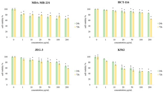 The effects of six concentrations of CSEO on MDA-MB-231, HCT-116, JEG-3, and K562 cell viability after 24 h and 72 h of treatment. Results are presented as the mean of three independent experiments ± standard error: * p < 0.05 relative to control.