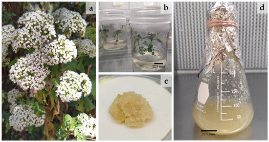 - Sánchez-Ramos, M.; Alvarez, L.; Romero-Estrada, A.; Bernabé-Antonio, A.; Marquina-Bahena, S.; Cruz-Sosa, F. Establishment of a cell suspension culture of Ageratina pichinchensis (Kunth) for the improved production of anti-inflammatory compounds. Plants 2020, 9, 1398. [Google Scholar] [CrossRef]