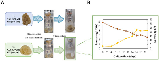 The treatments T3 and T4 were transferred to Murashige and Skoog (MS) liquid medium using the same concentration of PGR as in the CC (Figure 2A). The establishment of CSC was determined based on the performance of better callus disaggregation. Treatment T4 displayed greater disaggregation and dispersion of the cells that T3 at day seven of culture. Cell disaggregation when CSC processes are looked for is a parameter of great relevance for ensuring the mass transfer of nutrients to each individual cell, ensuring the cell viability, and improving the production of bioactive compounds. In this work, due to the best disaggregation of callus in the liquid medium, treatment T4 was selected for the establishment of CSC, growth kinetics were maintained for 21 days (Figure 2B), reaching a maximum biomass of 8.32 ± 0.22 g/L at 16 days, a growth rate (µ) of 0.1576 days−1 and a doubling time (dt) of 4.39 days−1. The following was performed, and the phytochemical characterization was performed at 12 and 16 days of culture. Similar results were obtained for Sánchez-Ramos et. al. [23] on CSC of A. pichichensis obtained from leaf explants at concentrations of, differing in this study, in which CSCs were obtained from nodal segment explants.