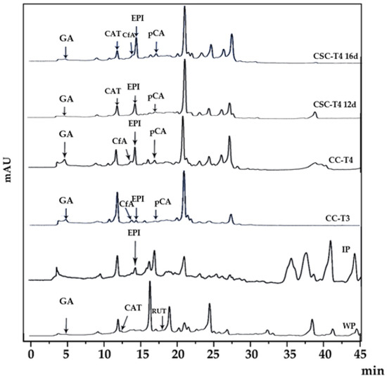 HPLC chromatograms for methanol extracts of A. pichichensis from wild plant (WP), in vitro plant (IP), callus culture (CC-T3 and CC-T4), suspension cell culture (CSC-T4 12d and CSC-T4-16d). Gallic acid (GA), catechin (CAT), caffeic acid (CfA), epicatechin (EPI), p-coumaric acid (pCA) and rutin (RUT).