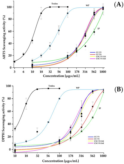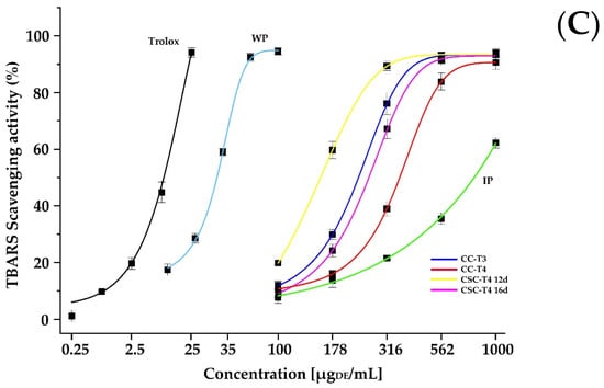 For ABTS inhibition, the extract from WP required lower concentration for inhibiting this radical reaching a plateau around 178 µgDE/mL, but higher than Trolox. For the rest of treatments, when the antioxidant concentration was below 100 µgDE/mL, the better antioxidant capacity was performed by IP, followed by CC-T3, and the rest of treatments, but above this concentration, the ihibition of ABTS was modified substantially by the CC and CSC treatments, with a significant reduction of antioxidant capacity in the IP extracts. Regarding the scavenging of the DPPH radical, Trolox and WP extract showed the same trend observed for ABTS, but for this radical CSC-T4 12d, CSC-T4 16d, and CC-T3 were grouped with better antioxidant capacity than CC-T4 and IP extracts. In the case of TBARS, Trolox and WP extract required lower concentrations for the inhibition of lipid peroxidation, followed by CSC-T4 12d, CC-T3, CSC-T4 16d, CC-T4, and IP extracts as those with the lesser antioxidant capacity. For all the treatments, the percentage of scavenging effect on the DPPH and ABTS radicals was increased with increasing the concentration of A. pichichensis extracts, where the highest percentage of DPPH radical inhibition was obtained in a concentration of 1000 μgDE/mL, with percentages of 94.32 ± 0.66, 90.14 ± 1.58, 93.14 ± 0.39 and 94.16 ± 0.19% for WP, IP, CC and CSC extracts, respectively. In the case of Trolox, the highest percentage inhibition was achieved at a concentration of 56.25 μgDE/mL. Table 2 shows the values for the IC50 from each extract required for inhibiting the 50% of the initial concentration of free radical.