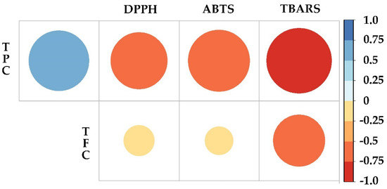 To elucidate the relationship between phenol and flavonoid content and antioxidant activity, Pearson’s correlation analysis was applied considering the TPC, TFC and IC50 obtained in the DPPH, ABTS and TBARS assays (Figure 5). Based on the results obtained, TPC showed a positive correlation (p < 0.05) with TFC, which demonstrates a direct correlation, i.e., the higher the phenol content, the higher the flavonoid content. In the case of TPC, the correlation was negative with DPPH (p < 0.05), ABTS (p < 0.01) and TBARS (p < 0.01). As for TFC, the correlation was also negative, however, with lower significance, for DPPH (p = 0.05), ABTS (p = 0.05) and TBARS (p < 0.05). Therefore, it could be concluded that the relationship of phenol and flavonoid content is inversely proportional to the IC50, i.e., the higher the content of bioactive compounds, the higher the antioxidant activity, and the lower IC50 value.