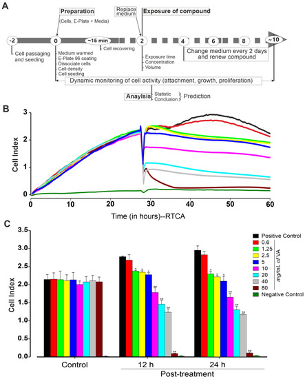 Experimental workflow for preparing, culturing, growing and recording compounds’ effect using the xCELLigence RTCA Cardio system. (A) On day 0, confluent miPSCs were dissociated and plated (at a density of 25,000 cells/well) into an E-Plate 96-well previously coated with fibronectin. Different concentrations of Vernonia amygdalina were generally added 24 h post-plating. Every two days, medium and/or compound were replaced with a fresh one. Cell activity (attachment, morphology, rate proliferation and size) was monitored for at least 10 days. (B) Exemplary recordings showing changes in cell index in the presence of different concentrations of VA as compared to positive (cell without treatment) and negative (well without cells) control conditions. (C) Peak cell index values before (24 h post-plating) and after treatment with VA at the concentrations of 0 (positive control), 0.6, 1.25, 2.5, 5, 10, 20, 40 and 80 mg/mL for 12 and 24 h. Data are presented as the mean ± SEM of three independent experiments. * p < 0.05 and # p < 0.05, significantly different compared with control and previous low concentration, respectively.