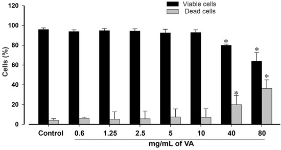 Statistical analysis of viable and dead cells in controls and VA-treated conditions. Vernonia amygdalina reduces the viability of mouse iPSCs in a concentration-dependent manner. Cells were incubated with increasing concentration of VA (0 to 80 mg/mL) for 24 h. Thereafter, the samples were washed to remove the compound. The cells were then allowed to recover in fresh medium for 2 h. After wise, Trypan blue exclusion method was used to assess cell viability. Suspension of each sample was mixed with 0.4% Trypan blue solution for 10 min and cells were counted in an EVE automatic cell counter (NanoEntek, VWR, Munich, Germany). Experiments were performed at least 3 times and results are presented as the mean ± SEM, and are statistically significant for * p < 0.05.