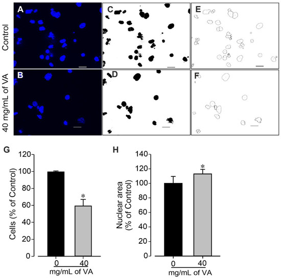 Quantification of cell nuclei using ImageJ as described previously. Cell cultures in the absence (control, 0 mg/mL of VA) and presence of 40 mg/mL of VA (treated) were observed using fluorescence microscopy after nuclei staining with Hoechst 33258. (A,B) Original image of nuclei from control (A) and VA-treated group of cells (B). (C,D) Nuclei thresholded image of control and treated cells. (E,F) Nuclei watershed boundaries of cells from control (E) and 40 mg/mL l VA-treated group (F). Images are representative of three independent samples. (G,H) Number of cells (G) and nuclear area (H) of control (0 mg/mL) and 40 mg/mL VA-treated cells. Data are presented as the mean ± SEM of three independent experiments. * p < 0.05, significantly different compared with control (0 mg/mL VA) condition. Scale bars: 50 µm.