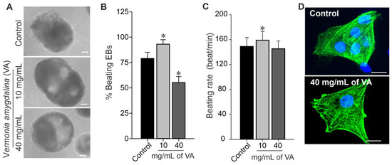 Mouse induced pluripotent stem cells (miPSCs) were differentiated into cardiomyocytes (CMs) by EB formation via mass culture protocol in the absence (control) and presence of different concentrations (10 and 40 mg/mL) of V. amygdalina. As shown in Figure 5A, the EBs generated under ethanolic extract of V. amygdalina exhibited the opposite effect in terms of morphology and growth properties. The low concentration of 10 mg/mL induced a significant increase in EBs’ size as compared to control EBs and those generated under high concentration (data not shown). The percentage of beating EBs generated in the presence of 10 mg/mL of V. amygdalina after 12 days of differentiation was significantly higher than those from control conditions (Figure 5B). However, a significant reduction in the percentage of spontaneously beating EBs was observed under 40 mg/mL V. amygdalina treatment after 12 days of differentiation. In addition, the beating rate (Figure 5C) was also increased under 10 mg/mL (156.0 ± 12.1 beats/min, p < 0.05) and relatively decreased under 40 mg/mL (145.2 ± 21.15 beats/min, p > 0.05) of V. amygdalina in comparison to the control (148.9 ± 14.3 beats/min).