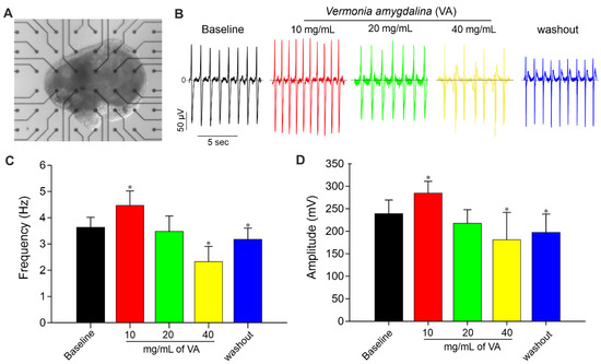 MEA Recording of cardiac clusters and effect of V. amygdalina. (A) Viable and spontaneously beating iPSC-derived cardiac cluster attached to MEA chamber during field potential (FP) recordings. (B) Representative FP traces of one electrode from MEA analysis of spontaneously beating iPSC-derived cardiac cluster demonstrating the effects of different concentrations (10, 20 and 40 mg/mL) of V. amygdalina. (C,D) Statistical analysis of FP frequencies (C) and amplitude (D) of baseline and V. amygdalina in MEA measurements of cardiac cluster. Data are shown as mean ± SEM of at least three independent experiments. * p < 0.05, significant difference between baseline and V. amygdalina-treated cardiac cluster.