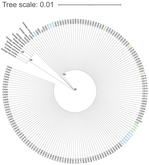 Phylogenetic tree of all S. canadensis populations based on ribosomal ITS and trnH-psbA intergenic spacer sequences. Blue represents Europe populations; green represents populations identified previously as S. altissima.
