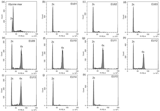 - Doležel, J.; Greilhuber, J.; Suda, J. Estimation of nuclear DNA content in plants using flow cytometry. Nat. Protoc. 2007, 2, 2233–2244. [Google Scholar] [CrossRef] [PubMed]