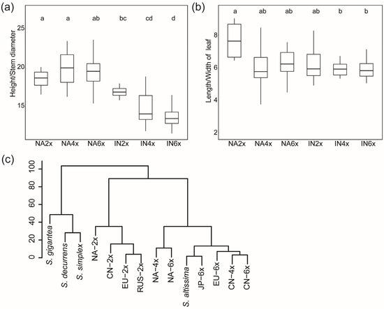A comparison of morphological traits of different geo-cytotype populations. (a) The ratio of length to width, (b) ratio of height to stem diameter, (c) cluster analysis based on 11 phenotypic traits. CN represents the population of China, EU represents the population of Europe, JP represents the population of Japan, NA represents the population of North America, and RUS represents the population of Russia; S. altissima includes populations of North America and Japan. Different lowercase letters indicate significance.