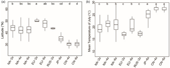 Comparison of latitude (a) and mean temperature of July (b) of different geo-cytotypes of S. canadensis in different regions. Note: CN represents the population of China, EU represents the population of Europe, JP represents the population of Japan, NA represents the population of North America, and RUS represents the population of Russia. Different lowercase letters indicate significance.
