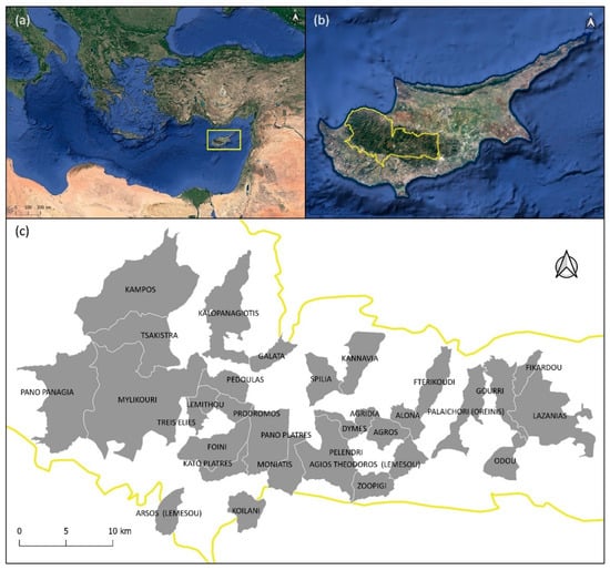 (a) The island of Cyprus (yellow rectangle; ©2022 Google). (b) Troodos Mountain Range (©2022 Google) covers the second phytogeographical division of the island (yellow line, [22]). (c) The 31 communities (grey shapes separated by white lines) included in the study area (yellow line).