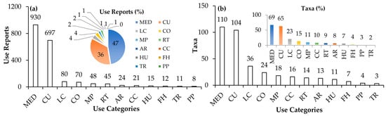 (a) The number of use reports (bar chart) and their percentage (pie chart) by use category. (b) The number of taxa reported (bar chart) and their percentage of the total number of taxa reported in the ethnobotanical study (colored bar chart) by use category. Use categories: medicinal (MED), culinary (CU), livestock care (LC), cosmetics (CO), manufacture–processing (MP), religious traditions (RT), animal repellent (AR), crop care (CC), household use (HU), fishing–hunting (FH), trade (TR), poisonous plants (PP).