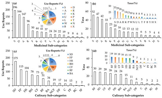 (a) The number of use reports (bar chart) and their percentage (pie chart) by medicinal sub-category. (b) The number of plant taxa reported (bar chart) and their percentage (colored bar chart) by medicinal sub-category. (c) The number of use reports (bar chart) and their percentage (pie chart) by culinary sub-category. (d) The number of plant taxa reported (bar chart) and their percentage (colored bar chart) by culinary sub-category. Medicinal sub-categories (according to ICPC-2): skin (S), digestive (D), general and unspecified (A), respiratory (R), eye (F), cardiovascular (K), urological (U), psychological (P), musculoskeletal (L), endocrine/metabolic and nutritional (T), pregnancy, childbearing (W), neurological (N), blood, blood forming organs and immune mechanism (B), female genital (X), male genital (Y), ear (H). Culinary sub-categories: sweets and desserts (SD), food preservation (FP), herbs & spices, (HS), hot beverage (tea; BH), cooked food ingredient (CF), raw food (RF), alcoholic beverage (BA), non-cooked food ingredient (NCF), dried fruits (DF), condiment (other; C), pickled food (PF), cold beverage (BC), smoke flavoring (SF).