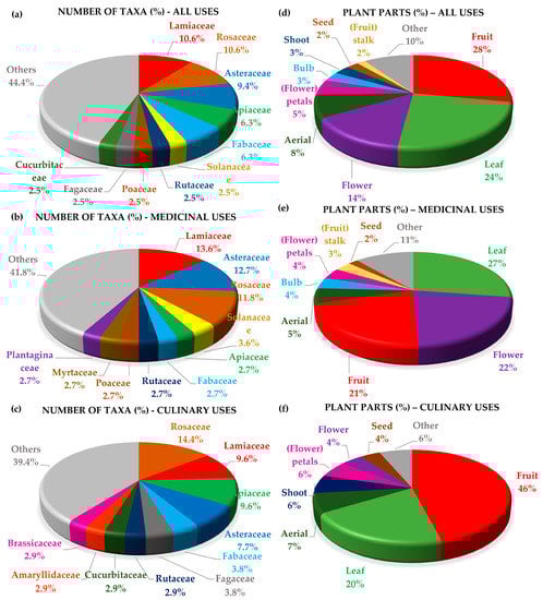 The percentage of reported taxa per plant family across all uses (a), with respect to medicinal uses (b), and culinary uses (c). The percentage of reported used plant parts across all uses (d), with respect to medicinal (e) and culinary uses (f).